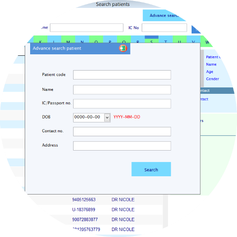 Most simple way to search for patient, by keyword of name, IC no., mobile no. and etc. DP even support barcode scan to search for patients.